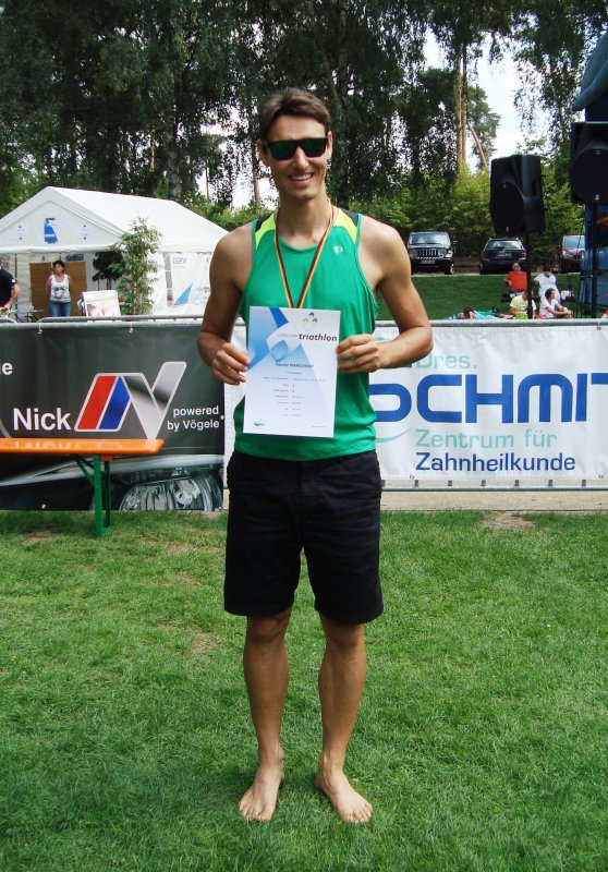 Ebenso erfolgreich war es für zwei Starter des TFF. Nur eine Sekunde trennte Sascha Marschner vom zweiten Platz in der Gesamtwertung (1:01:22 h). Sascha nahm an diesem Triathlon nun schon zum vierten Mal teil. Von Jahr zu Jahr hat er sich verbessert: nach Platz drei und Platz zwei in seiner Altersklasse gewinnt er nun die M30 und landet zum ersten Mal auf dem Podest in der Gesamtwertung. Nataliya Kovalova nahm auch zum 4. Mal teil und zum ersten Mal gewann sie ihre Altersklasse (01:12:01) und belegte 5.Platz der Gesamtwertung Frauen.